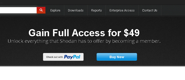 Untuk pertama kali, kita harus melakukan pendaftaran terlebih dahulu sebelum dapat memakai fitur search menggunakan filter pada Shodan, kita juga dapat meng-upgradeakun kita menjadi member dengan membayar sebesar $49 untuk seumur hidup, atau sekitar Rp. 650.000,- jika kita rupiah-kan, namun apabila tidak, kita tetap bisa menggunakannya, tetapi dengan dibatasi hasil pencarian yang hanya sebanyak 5 halaman saja.